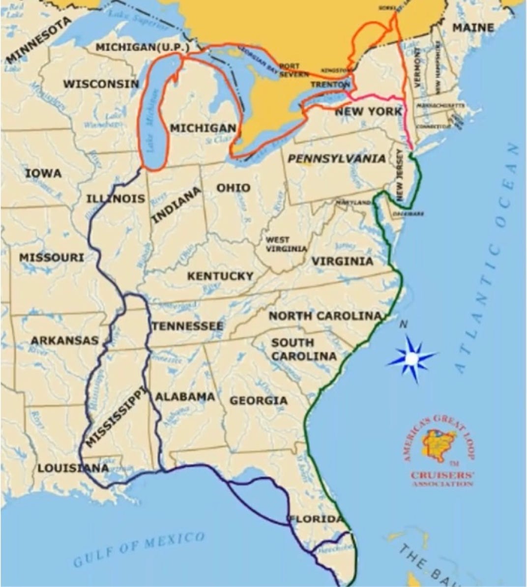 This map represents several routes for completing America’s Great Loop. We’re following the routes which provide the shortest path around the loop.